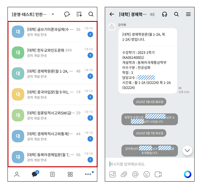 생성된 채팅방에는 수업에 참여하는 교수와 학생이 자동으로 초대되며 강의봇이 수강 변동 인원을 관리합니다. -